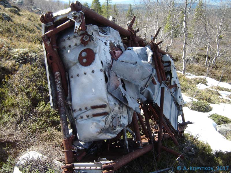 Летчик 2-й эскадрильи 27-го истребительного авиаполка ВВС Северного флота сержант САЛЬНИКОВ Борис Константинович, 08.10.1923 г.р., русский, место рождения: Северная Манчьжурия, г. Манчьжурия. Мать Сальникова Таисия Ивановна, проживала: г. Москва, Ленинская ЖД, ст. Вешники, Коммунистическая улица, д. 34. Добровольно зачислен в Военно-морское авиационное училище им. Сталина в ноябре 1940 года. Возвращаясь из похода в сторону автодороги Мурманск – Санкт-Петербург, на берегу небольшого озера обнаружили завалившуюся старую рыбацкую землянку, а рядом, сруб ледника, крышкой которого служил выпрямленный верхний капот «Харрикейна». Следов пожара на нем тоже не было. Очевидно, что во время посадки на каменистый склон самолет разрушился и летчик погиб. Хвостовое оперение, слетевшие капоты и мотор от огня не пострадали, а центроплан с кабиной были частично уничтожены во время пожара.