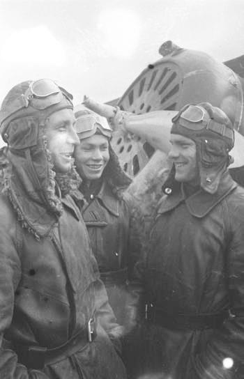 Командир звена самолетов лейтенант А.Я. Дижевский, мл. лейтенант Г.С. Ткаченко, лейтенант С.С. Арефьев.