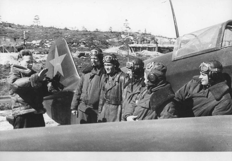Нашлось на Госкаталоге. Подписано, как "Герой Советского Союза капитан Евгений Васильевич Петренко со своими летчиками 20-ой эскадрильи СФ." Окраска киля необычная.