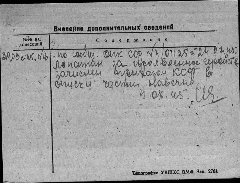 И приказом по КСФ навеки зачислен в списки части!Родился в 1919 году в селе Гнилево Трубчевского района Орловской области. Русский. Весной 1942 года окончил военную авиационную школу. Направлен на Северный флот.