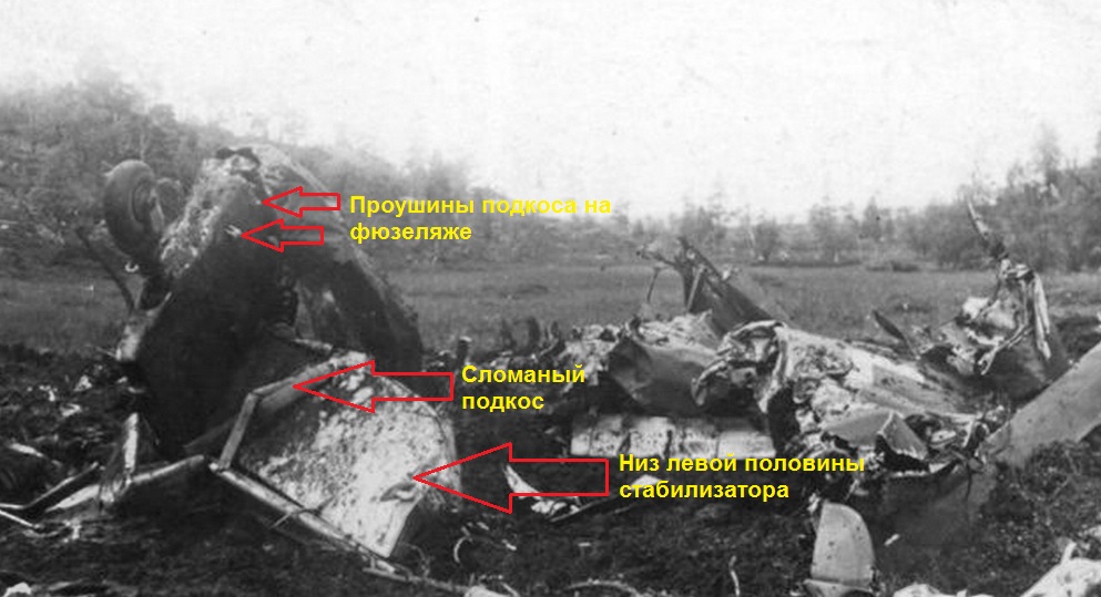 Самое интересное в том, что на фото обломки Ju 87B. Хорошо видно характерную для него стойку хвостового колеса и двойной подкос стабилизатора (сломан), а так же на фюзеляже видно проушины крепления этого подкоса.Колесо развёрнуто на 180 градусов.