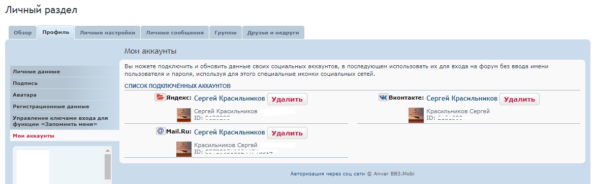 Если Вы хотите привязать указанные аккаунты к существующему здешнему, чтобы не вводить каждый раз при входе логин и пароль, то зайдите в свой Личный раздел -> Профиль -> Мои аккаунты -> и нажмите на нужные вам иконки.
