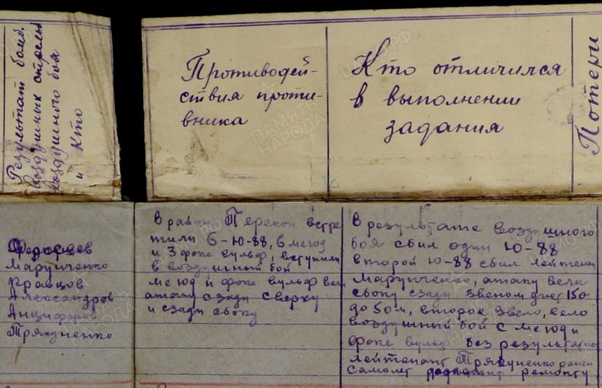 - на 3 странице ЖБД в событиях за 12.09 (правда события развивались в районе Перекопа), есть запись, что НЕКТО сбил Ю-88, а ВТОРОЙ Ю-88 сбил лейтенант Марунченко. Летали "шестеркой" ЛаГГов, в том числе и Анциферов. Так вот, кто этот НЕКТО?