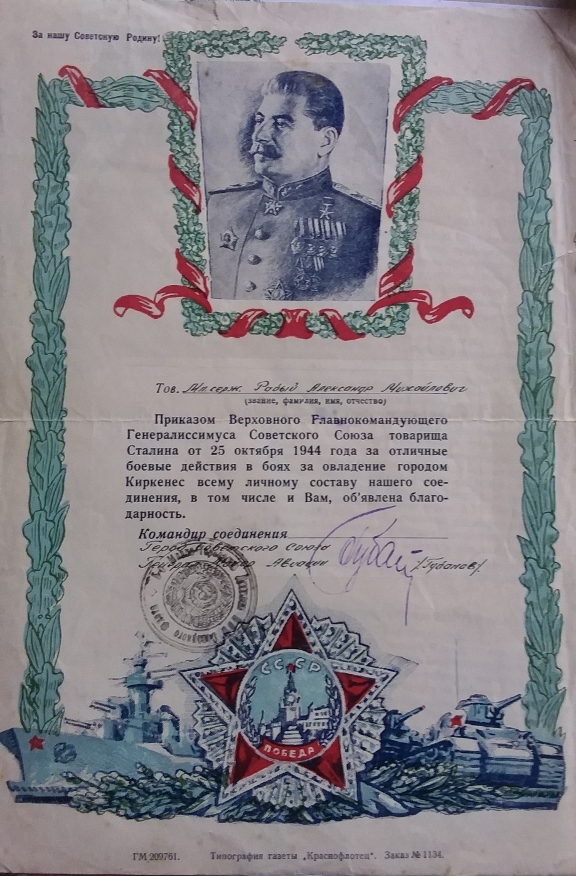 Здравствуйте! Я нашла грамоты отца военного времени ( в октябре 1944 года) за участие в боях за города Петсамо (Печенга) и Киркенес. Тогда же отец получил орден ВОВ 2 ст.