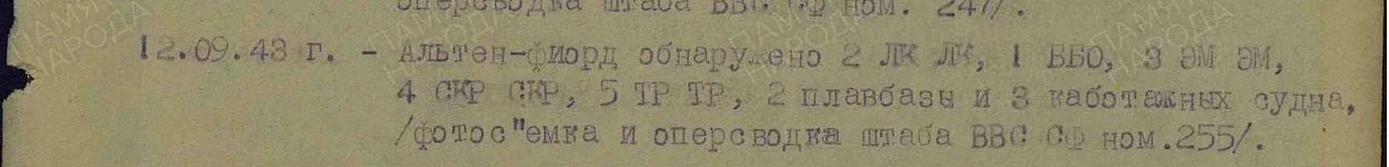 В сентябре 1943 года на Север опять прилетела группа английских разведчиков PR. Mk.lV. На этот раз их целью был Альтен-фьорд, где базировались германские линкоры «Тирпиц» и «Шарнхорст». Но англичанам отыскать их стоянку не удалось. Эту задачу на «Спитфайре» успешно выполнил 12 сентября 1943 года командир эскадрильи 118-го РАП ВВС СФ Леонид Ильич Елькин (в будущем - Герой Советского Союза, пропал безвести 29.02.1944 г.).
