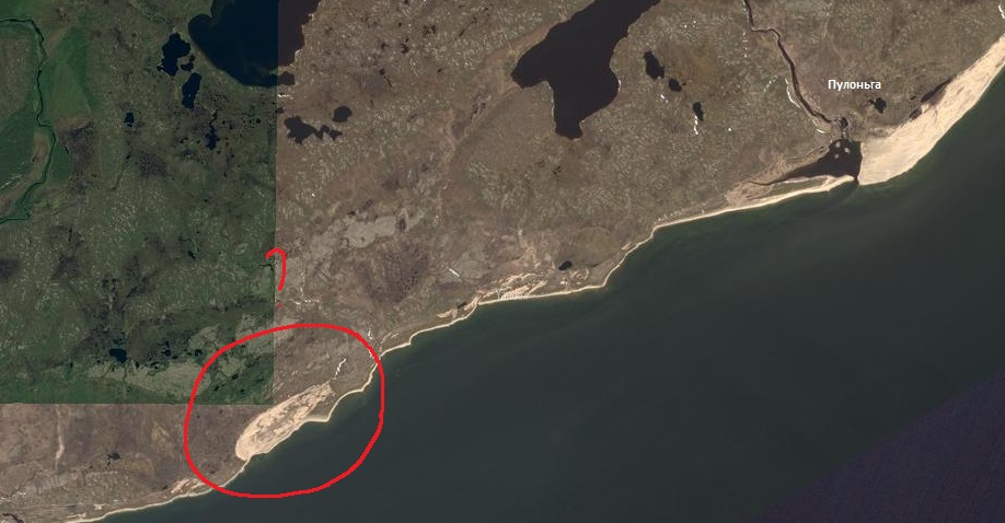С большой долей вероятности аэродром Пулоньга, или как он имел оперативное название "Скакун", располагался в районе с носящими то же наименование топонимами (обведено желтым) - ручьём Скакунский с истоком из озера Нижнее Пулоньгское, горушки, или скорее возвышенности Скакунской, и, как написано у Ю.Орешеты в "Серебряном ручье" - на мысе Скакун (возможно - Скакунском), точное нахождение которого мне определить не удалось, но со 100% вероятностью расположенном в непосредственной близости к одноимённым топонимам, так, как именно в том месте на, как говорят поморы - Летнем (или Терском) берегу горловины Белого моря (Зимний берег - "архангельская" сторона) есть до сих пор видимая площадка (обведена красным), совпадающая с размерами 1250х150 м.,указанными на карте аэродромной сети (см. в предыдущем посте).