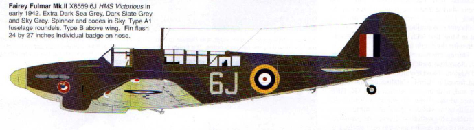 «Фэйри "Фульмар" Mk.II - X8559:6J, ЕВК "Викториес", начало 1942 г. Экстра-тёмного серовато-морского, тёмного синевато-серого и небесно-серого цветов. Кок винта и бортовые коды небесного цвета. Фюзеляжные опознавательные знаки типа A1. Крыльевые – типа B. Знак на киле – 24 на 27 дюймов, персональная эмблема на носу».