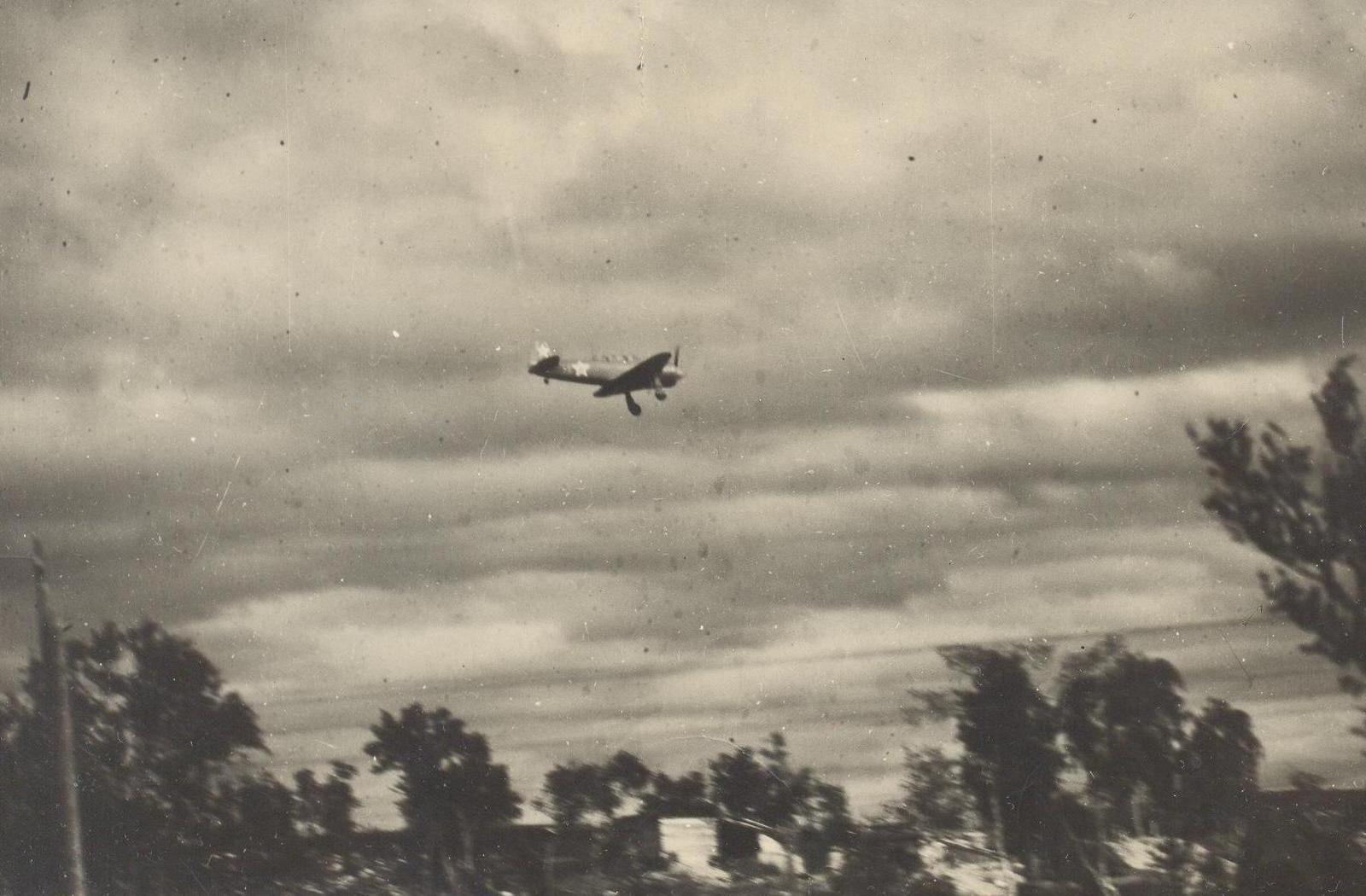 Больше похоже на посадку… Фото скорее всего послевоенное: учебно-тренировочный Як-11 (а судя по-всему, именно он изображён на снимке) впервые полетел в 1946 г…