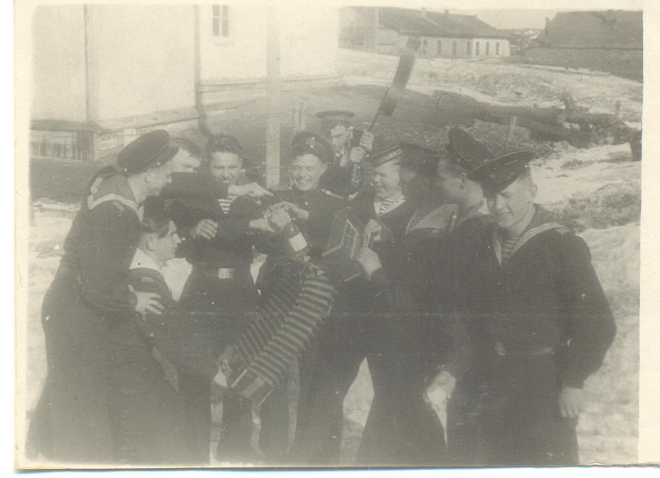 Отвечаю на вопрос механика, что на фото второй слева действительно мой отец Рабый Александр Михайлович, кроме того фото чуть раньше, где двое в тельняшках курят и подпись "Николай и Алдександр 25.06.1947", справа тоже мой отец, я помню это фото, оно было у нас дома, но много фото пропало где-то.