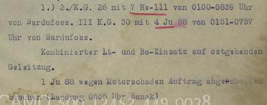 Этот фрагмент от 29 мая 1942 г. (стр.38), перевод следующий: «2./K.G.26 в составе 7 Хе-111 вылет 0100 посадка 0839 Uhr аэродром Бардуфосс. III K.G. 30 в составе 4 Ю-88 вылет 0151 посадка 0757, аэродром Бардуфосс. Комбинированное торпедное и бомбардировочное применение против идущего на восток конвоя. 1 Ю-88 прекратил задание из-за повреждения двигателя (Motorschaden) (произвёл посадку в 0555 на аэродроме Банак)». При этом самолет также никаких повреждений не получил и задание он прекратил ещё до атаки по кораблям и повреждение двигателя отмечено как отказ, вынудивший прекратить задание.