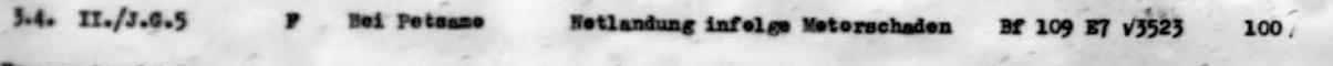 1) Этот фрагмент от 28 мая 1942 г. (стр.63), перевод его следующий: «II.J.G.5 в составе 9 Ме-109 взлет 21:35 посадка 22:25, аэродром Петсамо. Взлет по тревоге. Результат : 6 Ме-109 без соприкосновения с противником. 2 Ме-109 соприкосновение с противником в районе Лизы с 8-10 Томагавками без результата. Противостоящая оборона: хорошо ложащийся огонь легкой зенитной пушки в районе Motowski. В 21:45 один Ме109 с попаданием зенитной пушки 5 км севернее площадки в Айсмеерштрассе совершил вынужденную посадку». Наши документы раскрывают подробности этого боевого эпизода следующим образом. В 22:25 в район озера Нялъявр для отсечения истребителей противника от бомбардировщиков СБ 137-го КББП, вылетевших на бомбардировку аэродрома Луостари, вылетели 12 «Харрикейнов» 78-го ИАП. Здесь они провели воздушный бой, после которого нашим летчикам были засчитаны два сбитых «Мессершмитта-109»: старший лейтенант Сгибнев атаковал одного Ме-109 на встречных курсах, затем зашел ему в хвост и с дистанции 300-100 метров выпустил по нему 4-5 длинные пушечно-пулеметные очереди. «Мессершмитт» резко вошел в пикирование с черным дымом. Старший лейтенант Бабий атаковал второго Ме-109 сзади-сверху и с дистанции 350-70 метров выпустил по нему 3-4 пушечно-пулеметные очереди. «Мессершмитт» перевернулся и стал по докладу беспорядочно падать. То есть как минимум, один Ме-109 был подбит пушечно-пулемётной очередью и ушёл с чёрным дымом. Вероятнее всего, что именно пробоину от пушки ШВАК обнаружили немцы после приземления самолёта, а не зенитной пушки. Время воздушного боя в точности совпадает по нашим документам и документам противника (разница по московскому и европейскому времени была в 1 час). В любом случае боевое донесение 5-го ВФ даёт чёткую причину потери – боевая от попадания мелкокалиберной пушки. Но в документах генерал-квартирмейстерства эта потеря была занесена как небоевая опять же «Motorschaden» «повреждение двигателя» (файл 9 стр.178): 28.5.42 Bf 109 F-4 №10135 Notlandung infolge Motorschaden (Вынужденная посадка вследствие повреждения двигателя), повреждение в размере 80%.