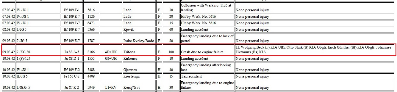 Вылетел с Петсамо в 10.48 на вооруженную разведку в море. В сводке записан, как упавший около выхода из Петсамо-фьорда.