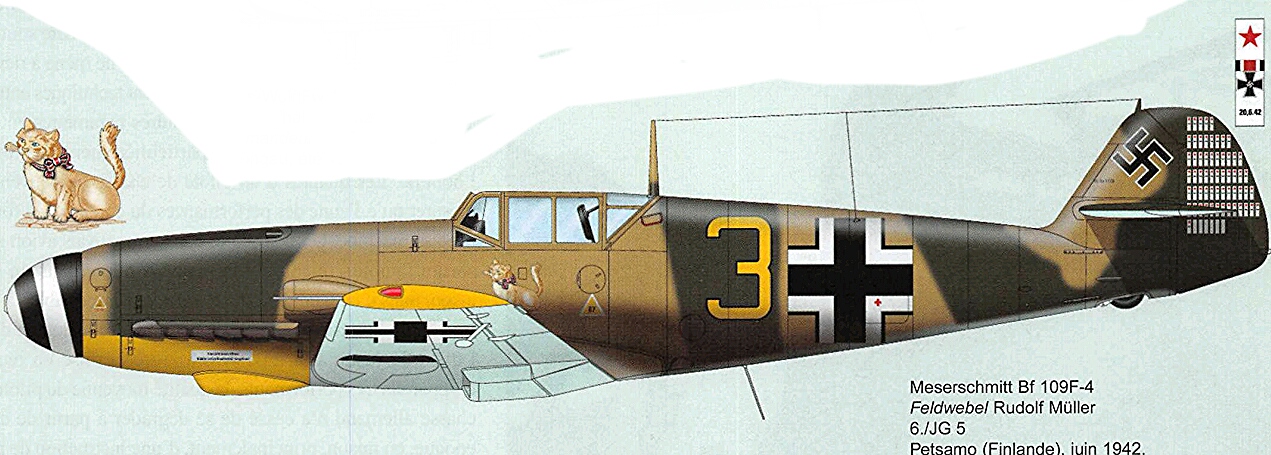- Эмблемы на фюзеляже истребителя Мессершмитт Bf.109F-4 фельдфебеля Гейнца Бейера (Heinz Beyer) из 8-й эскадрильи 5-й немецкой истребительной эскадры «Eismeer» («Полярное море»). Эмблемы на фюзеляже означают принадлежность к подразделению эскадры: щит с цветком эдельвейса — 8-я эскадрилья 5-й истребительной эскадры (8./JG5), щит с ботинком на фоне финского флага — 3-я группа 5-й истребительной эскадры (III.JG5). Рисунок в виде орла — личная эмблема пилота. Снимок интересен еще и тем, что позволяет предположить, что истребитель ранее входил в состав истребительной эскадры JG54 «Grünherz» («Зеленое сердце»). Видны слабые следы закрашенной эмблемы JG54 в виде сердца, поверх которого нарисован орел.