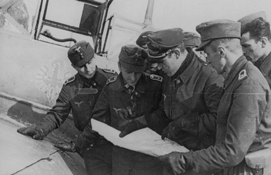 Oblt Hermann Segatz Staffelkapitän of 8.JG 5 Petsamo, April 1942. Рядом Oscar Thimm, Bartels и Otto Herzog.