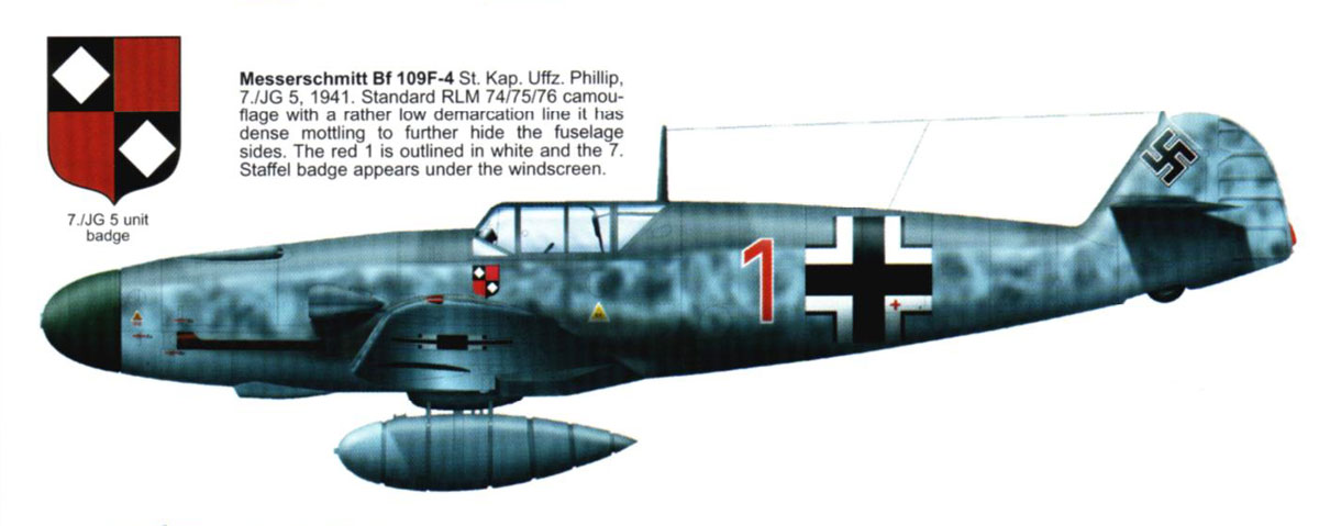 Эмблема 7./JG5 с синим полем сверху и красным снизу – это бывшая эмблема 1.(Ein)/JG3 (1 Einsatzstaffel/JG3 – 1-го штаффеля окончательной подготовки пилотов эскадры JG3 «Udet»), из которого, в январе 1942 г., и был сформирован 7./JG5, в составе III группы эскадры JG5, соответственно, к нему перешла и эмблема 1.(Ein)/JG3.