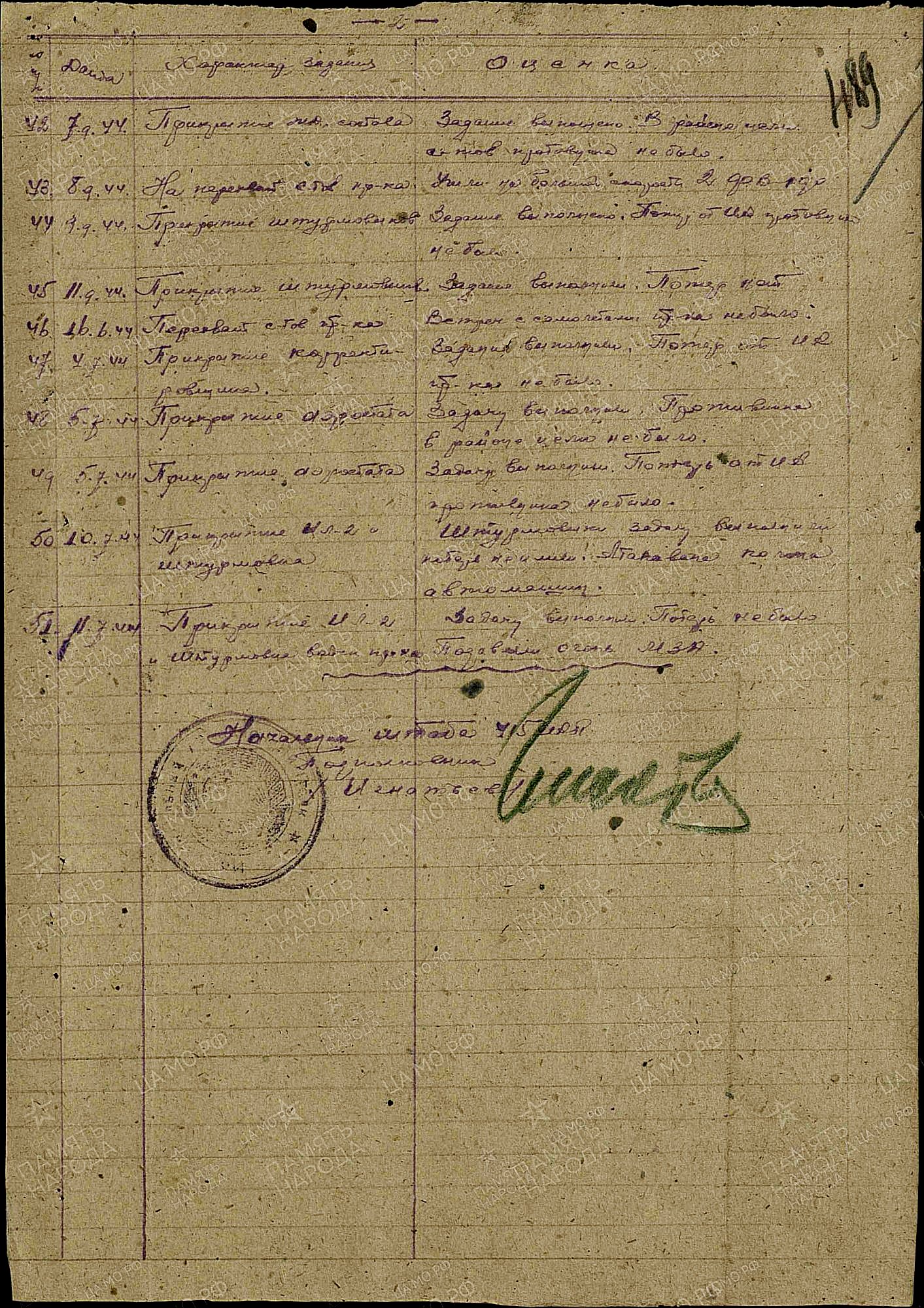 Выписка из журнала боевых действий на летчика лейтенанта Добромыслову Ксенью Ефремовну количестве боевых вылетов на выплату денежного вознаграждения согласно приказа НКО № 294 от 8 октября 1943 г. за 30 и 50 боевых вылетов: